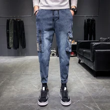 Related Product for Spring Summer Fashion Men Jeans Loose Fit Elastic Big Pocket Harem Pants Small Leg Vintage Designer Retro Wash Hip Hop Jeans Men