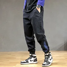 Fashion Streetwear Men Jeans Loose Fit Spliced Black Gray Cargo Pants Harem Jeans Korean Style Hip Hop Jeans Men Pencil Pants