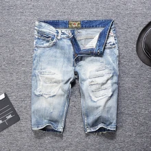 Light Blue Fashion Summer Men Short Jeans Retro Destroyed Ripped Short Jeans High Quality Streetwear Hip Hop Denim Shorts Men