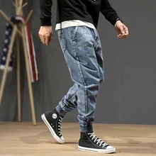 Buy Fashion Streetwear Men Jeans Loose Fit Vintage Designer Stripe Harem Pants Elastic Waist Japanese Hip Hop Jeans Men Pencil Pants up to 2098-12-31, and You will Save US $29.67 or 53%, Becuase You Just Pay for 26.31 not Full Price for 55.98