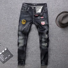 Buy Fashion Streetwear Men Jeans Retro Black Blue Color Slim Fit Patches Designer Ripped Jeans Men Punk Pants Hip Hop Jeans Homme up to 2098-12-31, and You will Save US $16.5 or 33%, Becuase You Just Pay for 33.59 not Full Price for 69.98