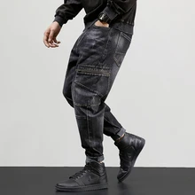 Fashion Streetwear Men Jeans Retro Black Gray Loose Fit Multi Pockets Cargo Pants Harem Jeans Japanese Style Hip Hop Jeans Men