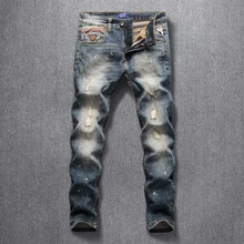 Related Product for Fashion Streetwear Men Jeans Retro Black Gray Slim Fit Destroyed Ripped Jeans Men Paint Designer Printed Pants Hip Hop Jeans