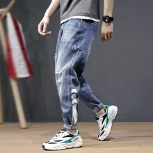 If You want to buy for Jeans, then Fashion Streetwear Men Jeans Blue Color Loose Fit Harem Pants White Printed Designer Small Leg Open Hip Hop Ripped Jeans Men may be make you like