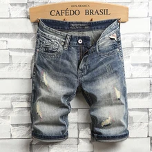 Related Product for Summer Fashion Men Jeans Shorts Retro Wash Embroidery Patchwork Ripped Jeans Men Denim Shorts Italian Style Hip Hop Short Jeans