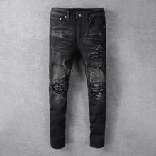 Related Product for Fashion Streetwear Men Jeans Retro Black Patchwork Ripped Jeans Men Destroyed Punk Pants Elastic Hip Hop Skinny Jeans Homme