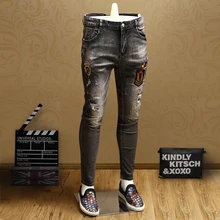Related Product for Mens Embroidery Ripped Jeans Dark Gray Skinny Jeans Men Denim Pants Big Size European PSMJ64