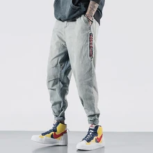 Related Product for Japanese Fashion Men Jeans Loose Fit Retro Light Blue Elastic Waist Harem Pants Embroidery Streetwear Hip Hop Tapered Jeans Men